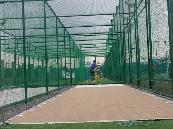 Complete setup of box cricket nets, practice nets, cricket turf pitches, and sports enclosures using professional-grade materials.